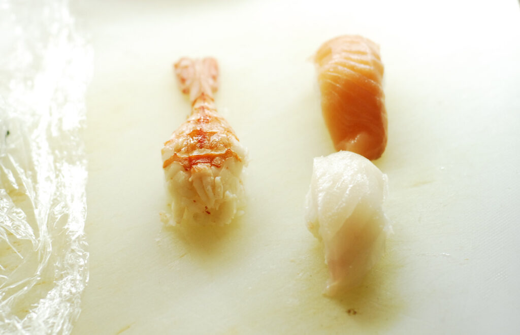 Κόβουμε πολύ προσεκτικά τον σολομό και τον παστό τόνο σε λεπτές φέτες. Αυτό, για να το πετύχουμε με γεωμετρική ακρίβεια, θα πρέπει να έχουμε δυνατό φωτισμό, ένα μαχαίρι ακριβείας και απόλυτη συγκέντρωση. Το μαχαίρι ακριβείας στην περίπτωσή μας είναι λεπτής λάμας. Χαράσσουμε το σχήμα πρώτα με τη μύτη και μετά κόβουμε, πάντα με τη μύτη του μαχαιριού προς τα κάτω να ακουμπά την επιφάνεια κοπής, και κατεβάζουμε ακολουθώντας τη γραμμή. Βράζουμε τις γαριδοουρές, αφαιρώντας το κέλυφος και αφήνοντας την ουρά για διακόσμηση.