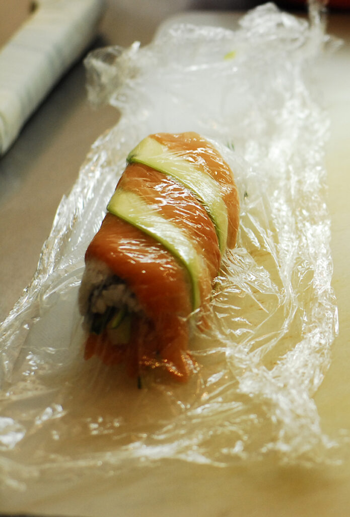Στη συνέχεια, τυλίγουμε τον κύλινδρο με λοξή κατεύθυνση τις φέτες σολομού και αβοκάντο, ώστε να καλυφθεί το φύλλο φυκιού. Αφού το σταθεροποιήσουμε, τυλίγουμε τον κύλινδρο με ένα λεπτό νάιλον και βάζουμε στο ψυγείο για 15 λεπτά, ώστε, με τη συστολή, να σφίξει ακόμα καλύτερα.