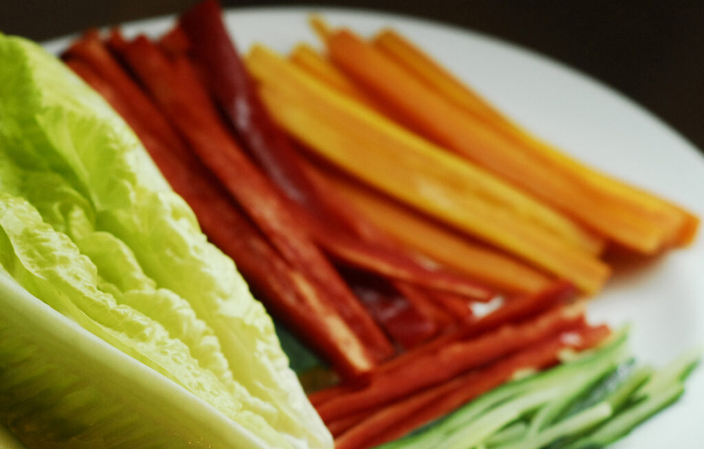 Πρώτα ακουμπάμε την μύτη του μαχαιριού στο ξύλο και κατεβάζουμε αργά τη βάση, κόβοντας με άνεση σε ευθεία γραμμή. Κάνουμε το ίδιο με το καρότο, την κόκκινη πιπεριά και το αγγούρι, κόβοντάς τα σε λεπτές λωρίδες. Πλένουμε το μαρούλι και το στραγγίζουμε όσο καλύτερα μπορούμε.