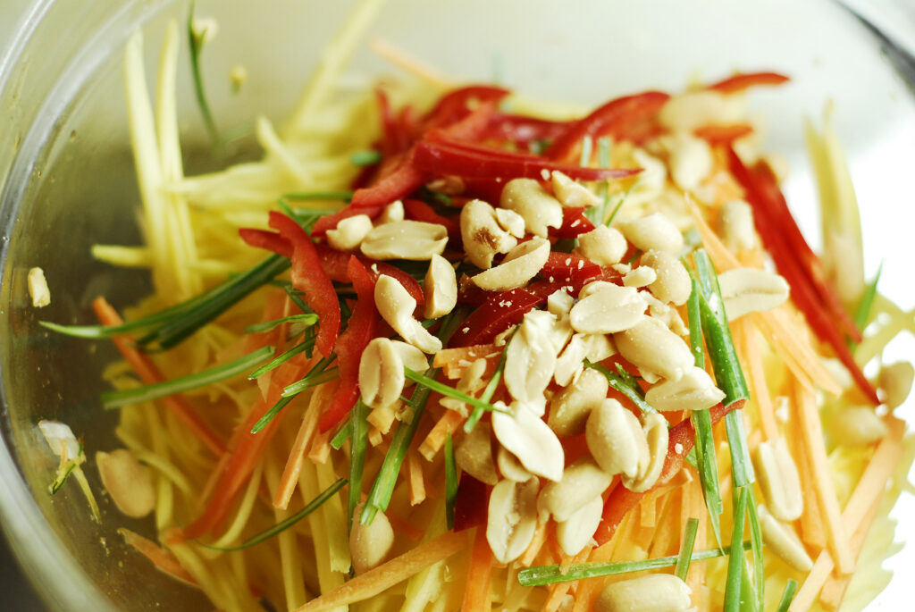 Καθαρίζουμε το μάνγκο και το κόβουμε σε λεπτές λωρίδες (julienne). Για να πετύχουμε τις ευθείες λωρίδες, ώστε να είναι ίσιες και με ενιαίο πάχος από το ένα σημείο ως το άλλο, πρέπει να χρησιμοποιήσουμε μαχαίρι ακριβείας σε ξύλινη επιφάνεια και να έχουμε καλό φωτισμό, ώστε να βλέπουμε καλά.