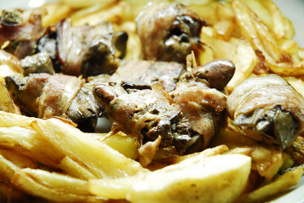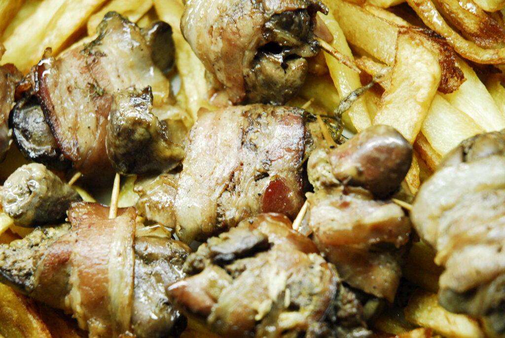 Συκωτάκια τυλιγμένα με μπέικον και τηγανιτές πατάτες