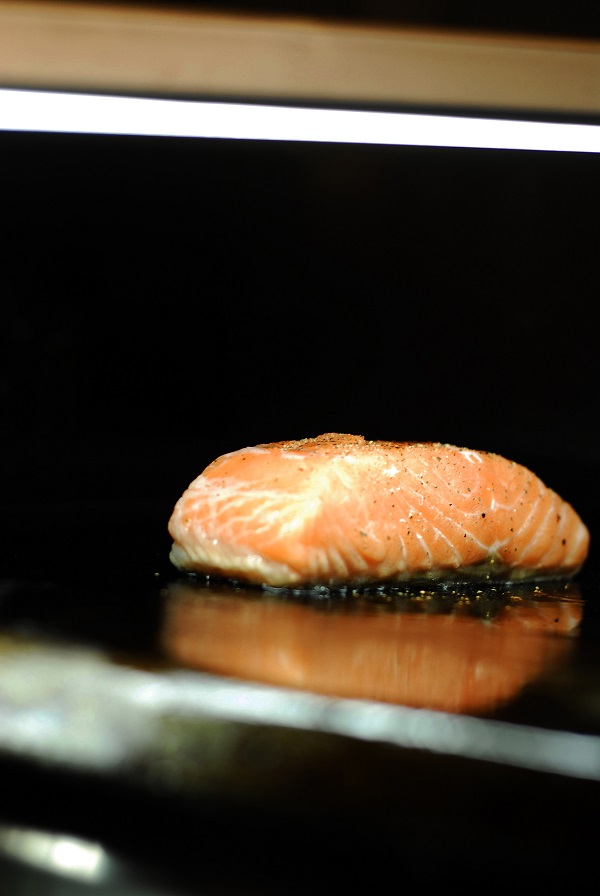 Ζεσταίνουμε το φυτικό λάδι σε αντικολλητικό τηγάνι σε μέτρια φωτιά. Το τηγάνι πρέπει να είναι ζεστό στην μεσαία σκάλα, για να μην καεί ο σολομός εξωτερικά πριν ψηθεί μέσα. Βάζουμε τα φιλέτα σολομού με το δέρμα προς τα κάτω και ψήνουμε για 3-4 λεπτά, χωρίς να τα πειράξουμε, μέχρι το δέρμα να γίνει τραγανό και το κάτω μέρος να πάρει χρυσαφί χρώμα.