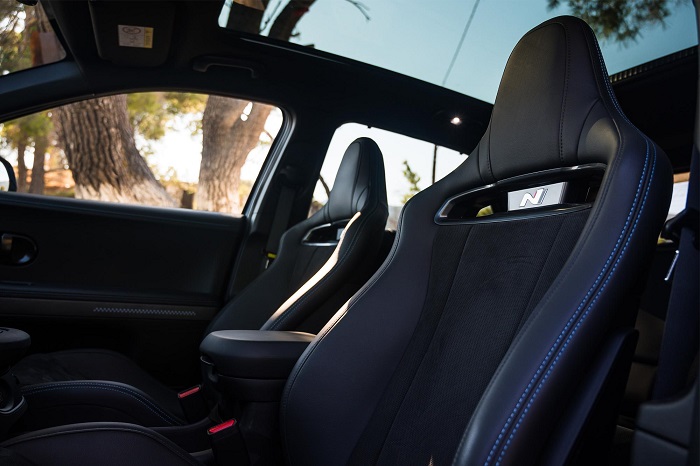 Το εσωτερικό έχει δεχθεί «παραδοσιακές» αναβαθμίσεις σπορ μοντέλου, δηλαδή πεντάλ με επένδυση αλουμινίου, γαλάζιες ραφές στις επενδύσεις, σπορ τιμόνι 370mm και ένα καταπληκτικό ζευγάρι bucket καθισμάτων που αγκαλιάζουν τέλεια το σώμα χωρίς να σε κουράζουν. Είναι επίσης κατεβασμένα κατά 2cm χαμηλότερα από ό,τι στο απλό Ioniq 5, η θέση οδήγησης του οποίου δεν θα ήταν κατάλληλη για την περίσταση.