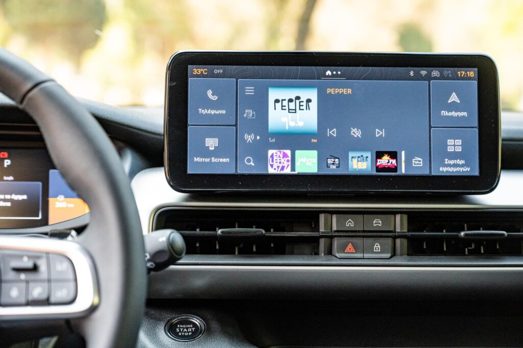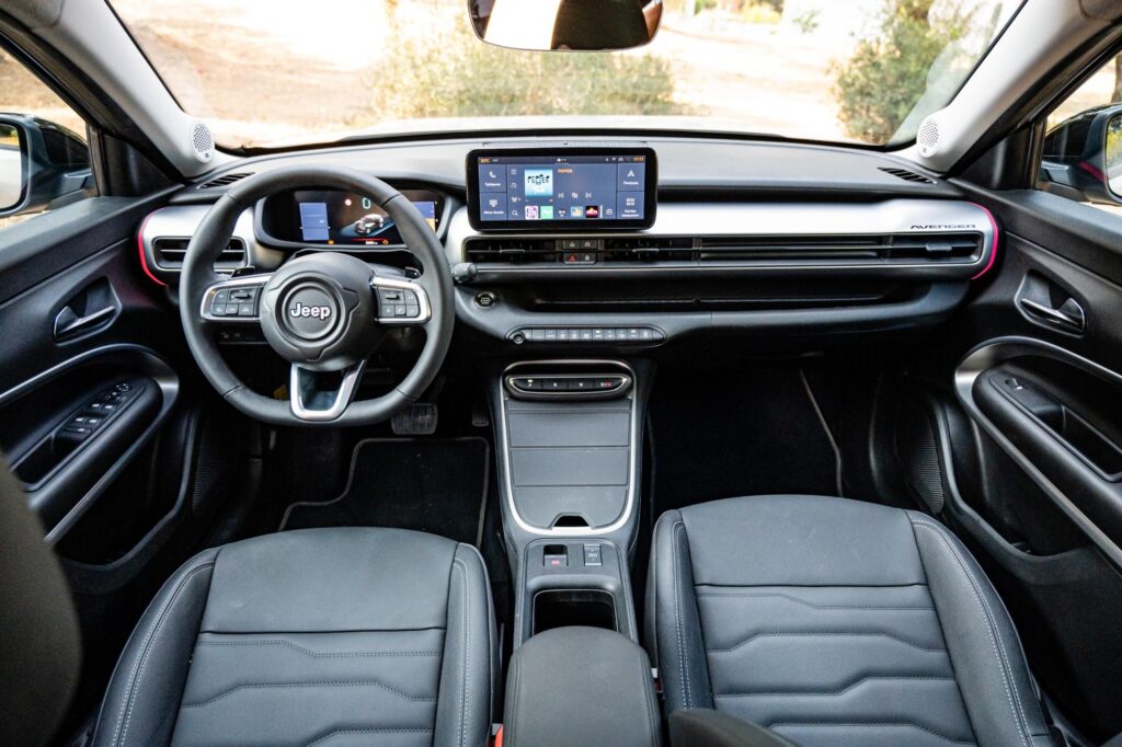 Ανοίγοντας την πόρτα του Jeep Avenger e-Hybrid, ο εσωτερικός διάκοσμος αποκαλύπτει μια νεανική και μοντέρνα εικόνα, με μεγάλες οθόνες, αντίστοιχες με την ηλεκτρική έκδοση, που τραβούν την προσοχή από τα σκληρά πλαστικά στις εσωτερικές επιφάνειες. Ναι, ό,τι πιάσεις είναι σκληρό, όμως τα υλικά διαθέτουν ευχάριστη υφή και πολύ καλή συναρμογή.