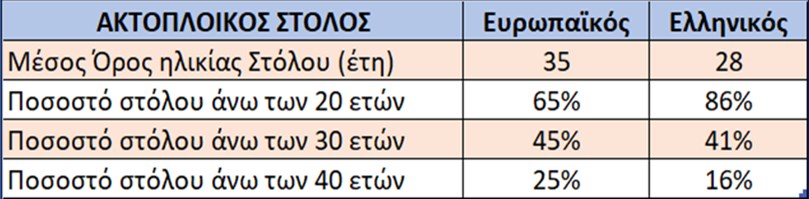 Μία από τις βασικότερες προκλήσεις που αντιμετωπίζει ο κλάδος είναι η γήρανση του στόλου. Ο μέσος όρος ηλικίας του Ελληνικού Ακτοπλοϊκού Στόλου είναι τα 28 έτη, ο οποίος είναι όμως μικρότερος από το μέσο όρο ηλικίας του Ευρωπαϊκού Ακτοπλοϊκού Στόλου, όπως φαίνεται στον πίνακα.
