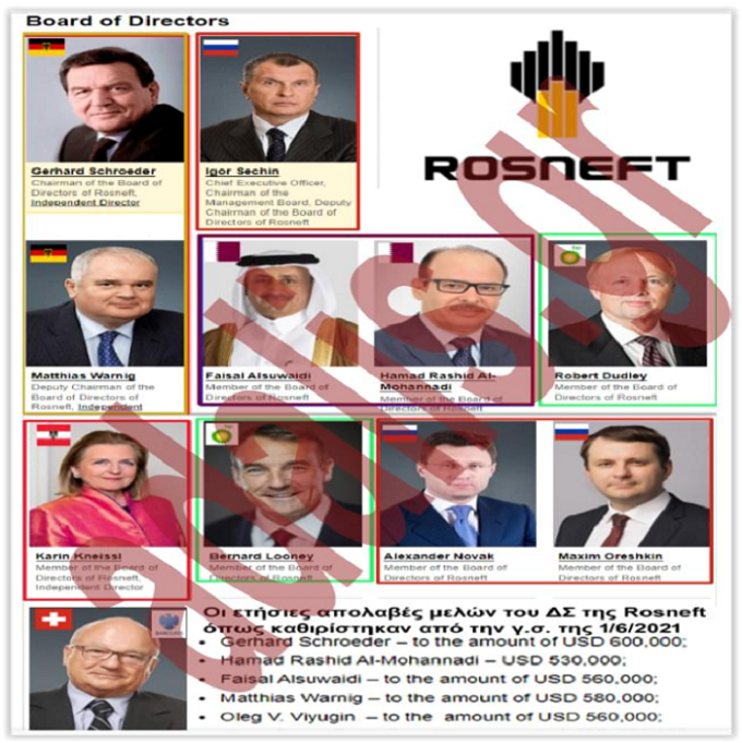 Από την προηγούμενη δεκαετία, το Διοικητικό Συμβούλιο της Rosneft είχε μέχρι και την άνοιξη του 2023, την σύνθεση που ακολουθεί στον παρακάτω πίνακα, όπου παρατίθενται και οι αμοιβές των μελών του, οι οποίες “ζαλίζουν”. Κατά την διάρκεια της πανδημίας, επανήλθα στο ζήτημα της Rosneft, με νέα ανάλυση που τόνιζε τον σπουδαίο ρόλο του Κατάρ στην ενεργειακή βιομηχανία της Ρωσίας.