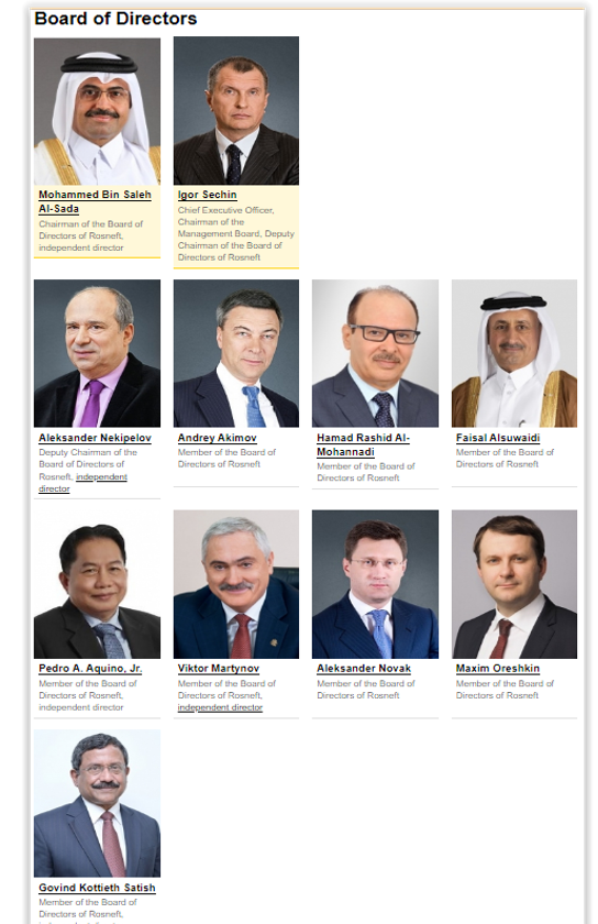 Κοιτώντας τις φωτογραφίες των μελών κάποιος αδαής περί τα ενεργειακά θα πίστευε ότι η Rosneft είναι αραβική όχι ρωσική εταιρία. Νέος πρόεδρός της αναλαμβάνει ο Μοχάμεντ μπιν Σαλέχ αλ-Σάντα, επίσης Καταριανός. Σπουδαγμένος κι αυτός στην Δύση και βραβευμένος από το Πανεπιστήμιο του Τέξας, ήταν ο υπουργός Ενέργειας του Κατάρ από το 2007 ως το 2018 και είναι ο εν ενεργεία πρόεδρος του Διοικητικού Συμβουλίου της κραταιάς Qatar Petroleum.