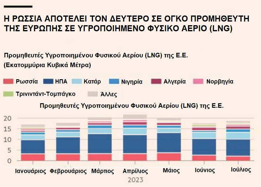 Σύμφωνα με στοιχεία της Guardian οι χώρες της ΕΕ προμηθεύονται στο πρώτο οκτάμηνο του 2023, 22 εκατ. m3 (κυβικά μέτρα) ρωσικού LNG, έναντι των 15 εκατ. m3 του πρώτου οκταμήνου του 2021. Η ΜΚΟ Global Witness, που αποτελεί την πηγή των πληροφοριών, επισημαίνει πως οι αγορές δεν διαφέρουν ουσιαστικά από τις ανάλογες ρωσικού αργού πετρελαίου, οπότε ουσιαστικά χρηματοδοτούν τις ρωσικές επιχειρήσεις στην Ουκρανία.
