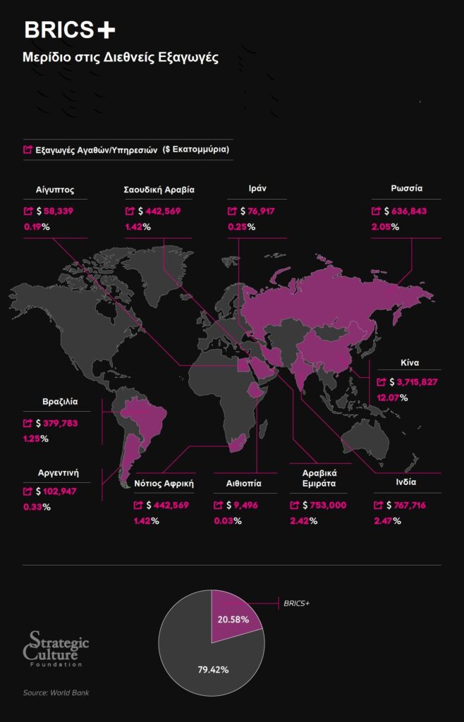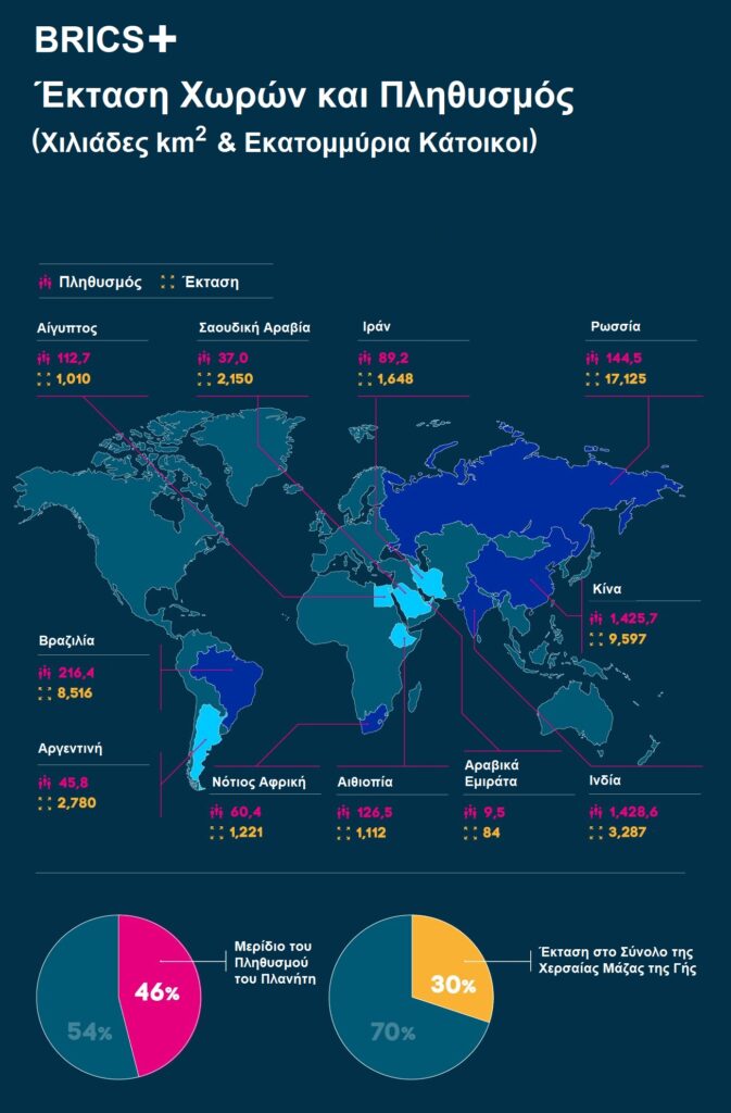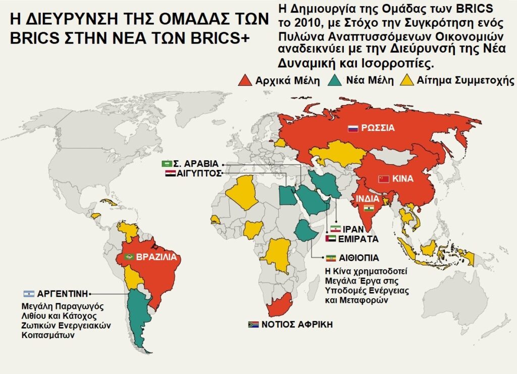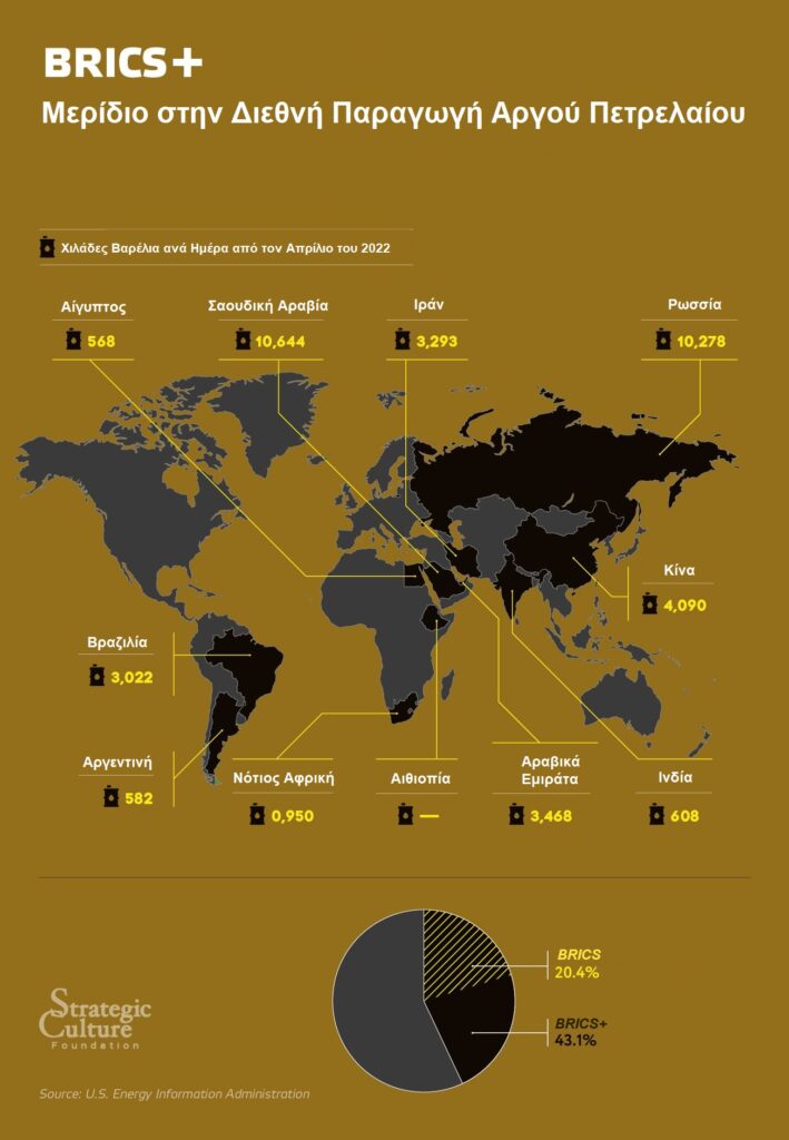 Με την είσοδο των νέων μελών (Αίγυπτος, Αιθιοπία, Αργεντινή, Εμιράτα, Ιράν, Σαουδική Αραβία), οι BRICS+ αποκτούν πλέον ένα μέγεθος ικανό να προκαλέσει μεγάλες γεωοικονομικές και γεωπολιτικές ανακατατάξεις. Εντυπωσιάζει, μάλιστα, η περιορισμένη έως ανύπαρκτη κάλυψη των σχετικών γεγονότων της διεύρυνσης των BRICS από τα δυτικά ΜΜΕ. Η διεύρυνση επιτρέπει στους BRICS+ να ελέγχουν συλλογικά το 43% της παγκόσμιας παραγωγής αργού (ο OPEC ελέγχει το 38%), γεγονός που τους καθιστά ενεργειακά εντελώς αυτόνομους, αποκλείοντας ενδεχόμενες κινήσεις παραγωγών που επηρεάζονται από τη Δύση να απειλήσουν την ενεργειακή κάλυψη του κλαμπ. Επιπλέον το μεγάλο μερίδιο επιτρέπει ευχερέστερη χειραγώγηση των τιμών, με προφανείς γεωπολιτικές επιπτώσεις.