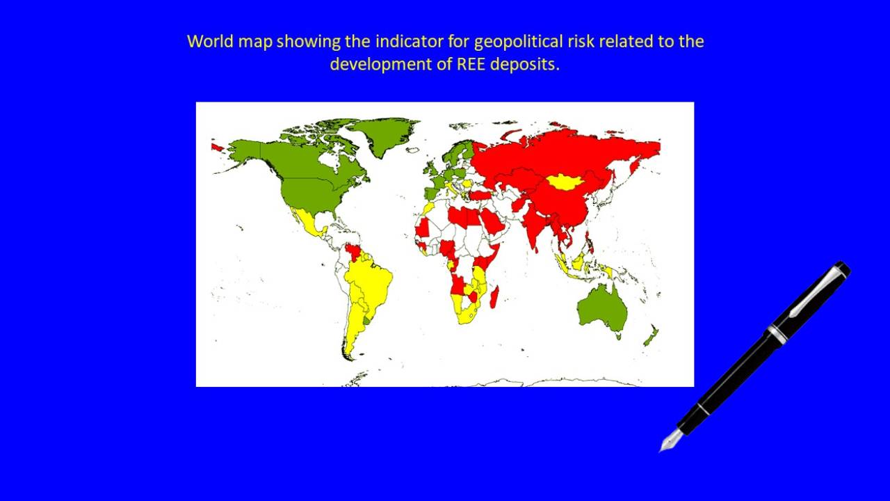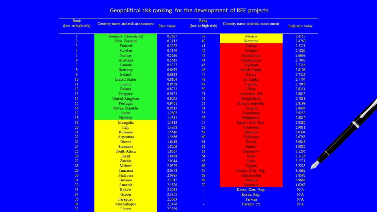 Το 2015 σε παγκόσμιο συνέδριο ορυκτών πόρων στο Βανκούβερ του Καναδά είχε παρουσιασθεί μία εργασία του γράφοντα για τις σπάνιες γαίες. Η εργασία παρουσίαζε την κατάταξη χωρών οι οποίες διαθέτουν αποθέματα σπάνιων γαιών σύμφωνα με τον γεωπολιτικό τους κίνδυνο (η επιστημονική εργασία βρίσκεται ανοικτή στο διαδίκτυο) . Η κατάταξη των χωρών δημιουργήθηκε χρησιμοποιώντας πέντε ισοβαρείς γεωπολιτικούς δείκτες: Πολιτική Σταθερότητα / Απουσία Βίας-Τρομοκρατίας, Επίπεδο Διαφθοράς, Σύστημα Ασφάλειας, Επίπεδο Πολεμικών Συρράξεων / Συγκρούσεων, και Πολιτικά Δικαιώματα / Ατομικές Ελευθερίες. Συνολικά αξιολογήθηκαν 70 χώρες στις οποίες αναγνωρίσθηκαν 561 αποθέματα σπάνιων γαιών.