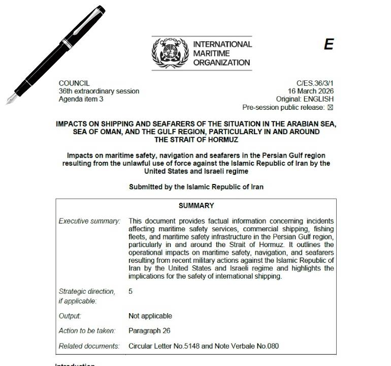 «Η Ισλαμική Δημοκρατία του Ιράν υποστηρίζει σθεναρά ότι η τρέχουσα επιδείνωση του περιβάλλοντος θαλάσσιας ασφάλειας στην περιοχή του Περσικού Κόλπου είναι άμεση συνέπεια των συνεχιζόμενων επιθετικών ενεργειών κατά του Ιράν από τις Ηνωμένες Πολιτείες και το ισραηλινό καθεστώς. Οι αρνητικές θαλάσσιες επιπτώσεις που επηρεάζουν επί του παρόντος τη ναυτιλία και τους ναυτικούς είναι άμεση και αναπόφευκτη συνέπεια αυτών των παράνομων ενεργειών και δεν μπορούν να εξεταστούν μεμονωμένα από την υποκείμενη αιτία τους», “απάντησε” με έγγραφό του το Ιράν, δηλώνοντας ότι οι ισχυρισμοί πως μπλοκάρει το στενό ήταν «παραπλανητικοί».