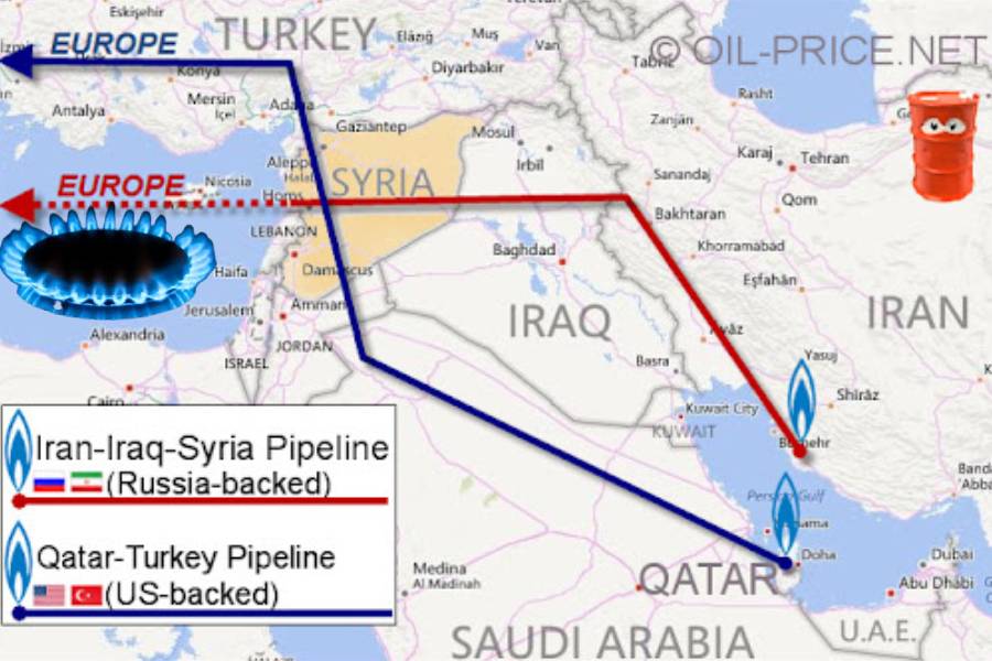 Στο ίδιο άρθρο, ο αρθρογράφος Ahmed Nafeez, συνεχίζει σχετικά με τον ανταγωνιστικό αγωγό σιιτικών συμφερόντων: «Αντί αυτού, το επόμενο έτος (2011), ο Άσαντ συνέχισε τις διαπραγματεύσεις για ένα εναλλακτικό σχέδιο αγωγού με το Ιράν, αξίας 10 δισεκατομμυρίων δολαρίων, σύμφωνα με το οποίο ο προταθείς αγωγός αφού θα διερχόταν από το Ιράκ, θα περνούσε από τη Συρία και θα επέτρεπε δυνητικά στο Ιράν να προμηθεύσει με φυσικό αέριο την Ευρώπη από το κοίτασμά του, το South Pars, το οποίο μοιράζεται με το Κατάρ».