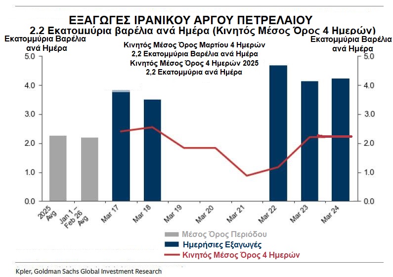 Στην τρίτη εβδομάδα του Μαρτίου, μειώνονται σχεδόν κατά δύο τρίτα στα 9,71 εκατομμύρια βαρέλια ανά ημέρα, με τον οίκο VORTEXA να καταθέτει ακόμα πιο ανησυχητικά δεδομένα, με την παραγωγή του Φεβρουαρίου στα 26,1 εκατομμύρια ανά ημέρα και την ανάλογη στα τέλη Μαρτίου μόλις στα 7,5 εκατομμύρια βαρέλια ανά ημέρα. Ο οίκος διαχειρίζεται ταυτόχρονα έναν επαγγελματικό ιστότοπο, που παρακολουθεί για τα στελέχη της αγοράς ενέργειας τις ενεργειακές ροές, που ακολουθούν θαλάσσιους διαδρόμους, παρέχοντας πολύτιμα δεδομένα για τις κινήσεις φορτίων.