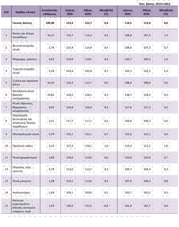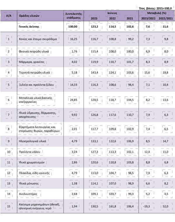 Σύμφωνα με τον γενικό δείκτη τιμών υλικών κατασκευής νέων κτηρίων-κατοικιών (ΕΛΣΤΑΤ) με έτος βάσης το 2015 και μήνα αναφοράς τον Ιούνιο 2023, σε σύγκριση με τον αντίστοιχο δείκτη του Ιουνίου 2022 (βλέπε πίνακες) παρουσιάζεται αύξηση 7,6%, έναντι αύξησης 11,6% που σημειώθηκε κατά τη σύγκριση των αντίστοιχων δεικτών του έτους 2022 με το 2021.