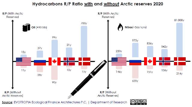 Σύμφωνα με το στοχαστικό μοντέλο της USGS, εκτιμήθηκε ότι με μια διαβάθμιση πιθανότητας (1-100%) η Αρκτική διαθέτει 90 δισ. βαρέλια πετρελαίου (bb) και 566 τρισ. κυβικά μέτρα (tcm) φυσικού αερίου. Συνολικά, αυτές οι ποσότητες αντιστοιχούν στο 13% των διεθνώς διαπιστωμένων κοιτασμάτων πετρελαίου και στο 30% των διεθνώς διαπιστωμένων αποθεμάτων φυσικού αερίου.