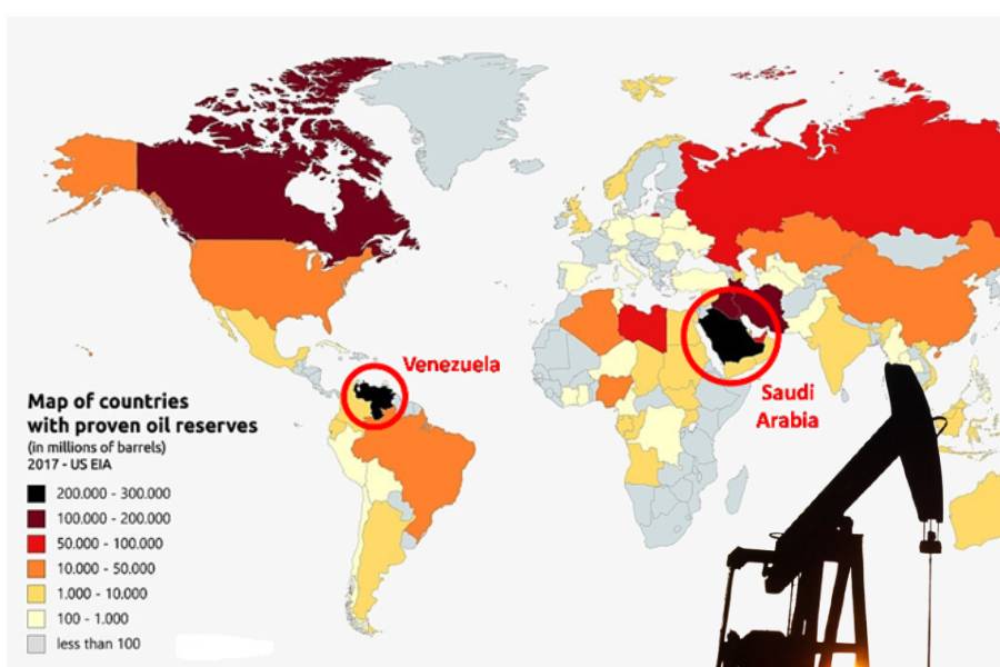 Συγκεκριμένα, οι ΗΠΑ διαθέτουν το ~17% της διεθνούς ικανότητας παραγωγής αργού πετρελαίου, με την Κίνα να διαθέτει επίσης ~17% και την Σαουδική Αραβία να διαθέτει το ~12%. Σε επίπεδο διεθνών αποθεμάτων (δηλ. αργού πετρελαίου στο υπέδαφος) ωστόσο, οι ΗΠΑ διαθέτουν μόλις το 4% ενώ η Κίνα μόλις το 1.5%. Αντίθετα, η Σαουδική Αραβία και η Βενεζουέλα διαθέτουν έκαστη το ~18% των διεθνών αποθεμάτων, με την Βενεζουέλα ωστόσο να καλύπτει μόλις το 1% της διεθνούς παραγωγής, καθώς της λείπουν τεχνογνωσία και σχετικές επενδύσεις. Εν ολίγοις, η Βενεζουέλα διαθέτει σε αφθονία τον φυσικό πόρο και οι ΗΠΑ τις υποδομές επεξεργασίας του προς διεθνή διανομή.