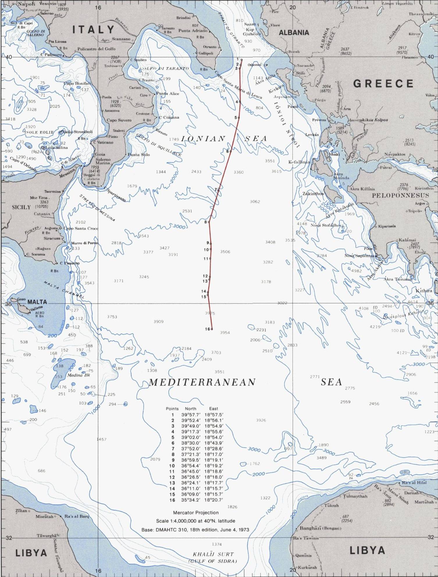 Demarcation method: The demarcation was done on the basis of the middle line which is the main position of Greece (but also of Italy). The demarcation is simplified (hence the 16 points), as was customary at the time the continental shelf was demarcated in 1977.