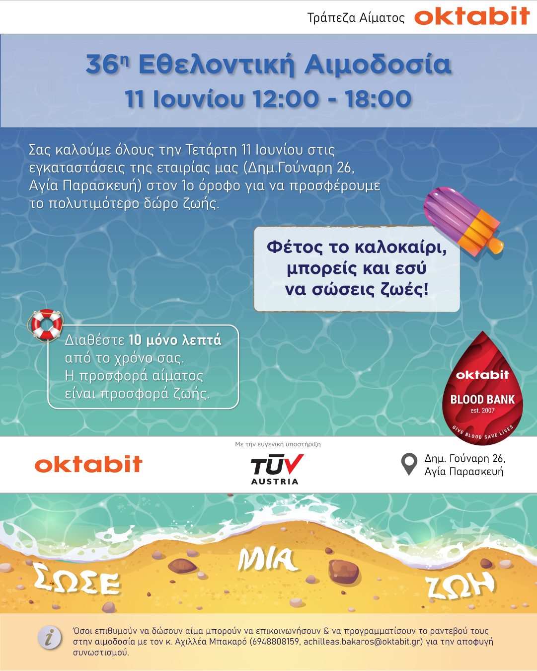 H Οktabit διοργανώνει στις 11 Ιουνίου 2025 την “36η Εθελοντική Αιμοδοσία της Τράπεζας Αίματος Oktabit” και με χαρά προσκαλεί τους συνεργάτες της στη γιορτή προσφοράς και αλληλεγγύης.