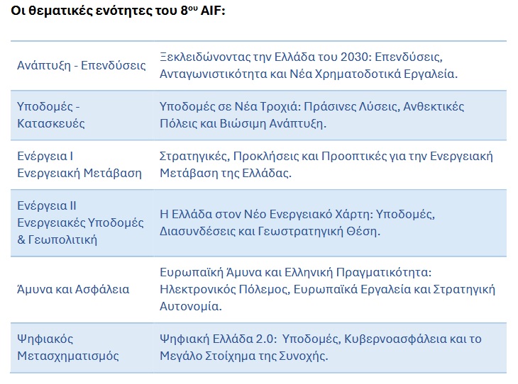 Σε συντονισμό με τις προτεραιότητες της αγοράς και τις διεθνείς τάσεις, το 8ο AIF παρουσιάζει μια θεματολογία αιχμής, με σταθερούς πυλώνες τις ενότητες Ανάπτυξη – Επενδύσεις, Υποδομές – Κατασκευές, Ενέργεια και Ψηφιακός Μετασχηματισμός. Φέτος, εισάγεται για πρώτη φορά η ενότητα Άμυνα και Ασφάλεια, υπογραμμίζοντας τη σημασία ενός τομέα που αποκτά ολοένα και μεγαλύτερη βαρύτητα στην Ευρώπη και διεθνώς. Η ενότητα θα επικεντρωθεί στη συμβολή της άμυνας στην ενίσχυση της εθνικής ασφάλειας, την τεχνολογική αυτοδυναμία και την αξιοποίηση ευρωπαϊκών εργαλείων συνεργασίας, αναδεικνύοντας τον ρόλο της Ελλάδας ως αξιόπιστου εταίρου σε μια εποχή γεωπολιτικής ρευστότητας.