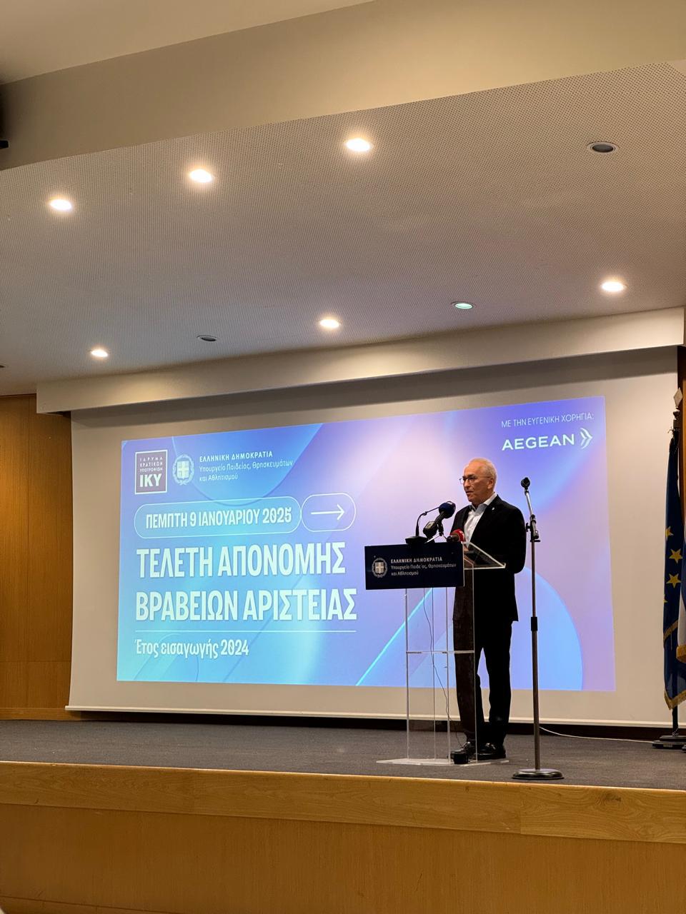 • Τα βραβεία για τους περίπου 2.300 δικαιούχους φοιτητές ανακοινώθηκαν από τον CEO της AEGEAN, κ. Δημήτρη Γερογιάννη, παρουσία του Υπουργού, κ. Κυριάκου Πιερρακάκη, και της Προέδρου του ΙΚΥ κ. Βάσω Κιντή, αναδεικνύοντας τη διαχρονική δέσμευση της αεροπορικής να επιβραβεύει την αριστεία.