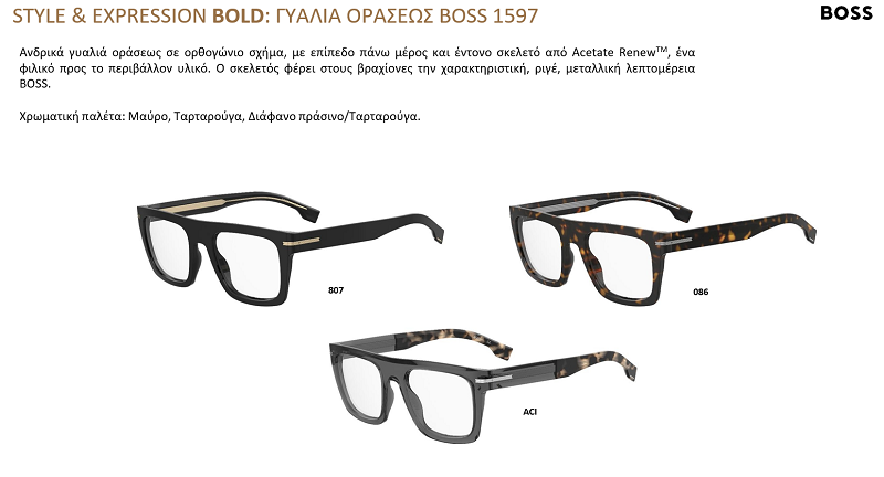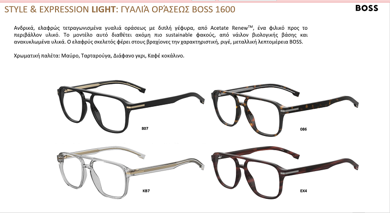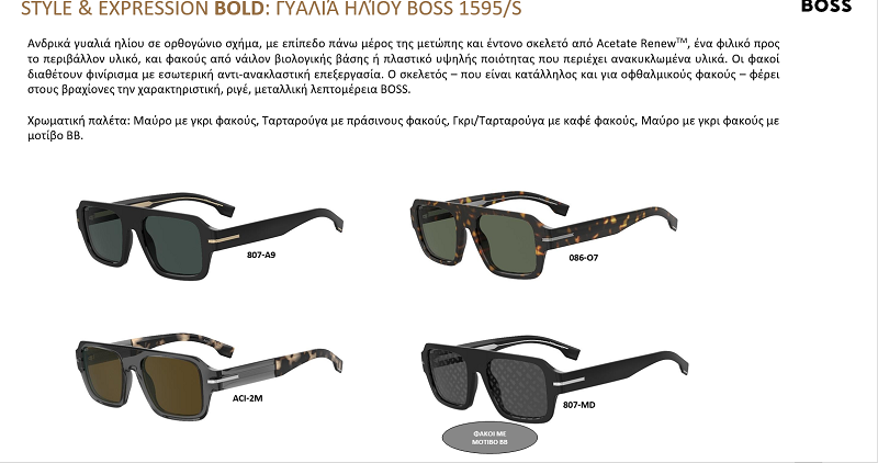 Για τη σεζόν Φθινόπωρο/Χειμώνας 2023, η ανδρική Συλλογή Γυαλιών BOSS παρουσιάζει νέα γυαλιά ηλίου και οράσεως από καινοτόμα υλικά που ξεχωρίζουν για τις χαρακτηριστικές τους λεπτομέρειες.