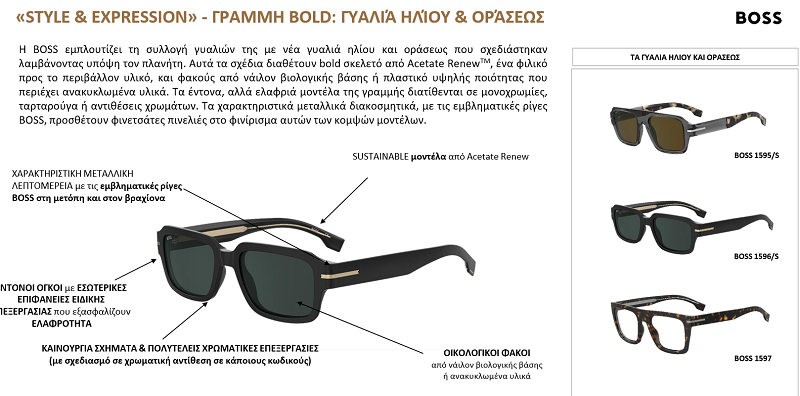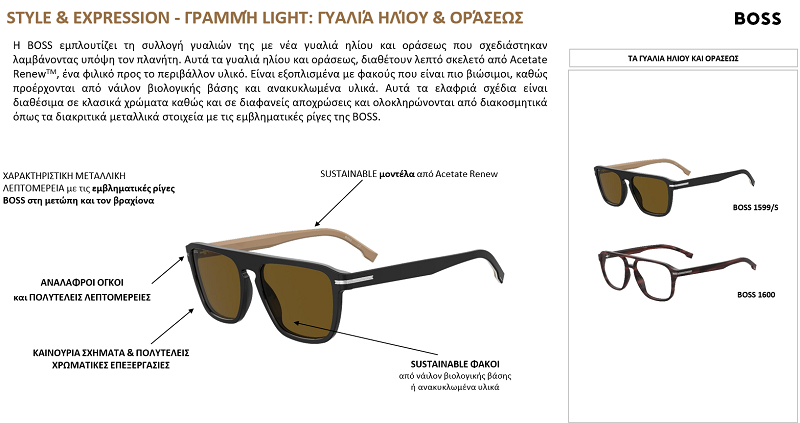 Η σειρά «STYLE & EXPRESSION» διαθέτει τολμηρά, ΕΛΑΦΡΙΑ μοντέλα γυαλιών, ΠΟΥ ΣΧΕΔΙΑΣΤΗΚΑΝ ΛΑΜΒΑΝΟΝΤΑΣ ΥΠΟΨΗ ΤΟΝ ΠΛΑΝΗΤΗ και κατασκευάστηκαν από ACETATE RENEWTM, ένα φιλικό προς το περιβάλλον υλικό, με φακούς από νάιλον βιολογικής βάσης ή πλαστικό υψηλής ποιότητας που περιέχει ανακυκλωμένα υλικά. Αυτά τα νέα γυαλιά ηλίου και οράσεως ΕΙΝΑΙ ΔΙΑΘΕΣΙΜΑ σε ΜΟΝΟΧΡΩΜΙΕΣ, ταρταρούγα ή χρωματικές αντιθέσεις και διακοσμούνται με τη χαρακτηριστική μεταλλική λεπτομέρεια με τις εμβληματικές ρίγες της BOSS.