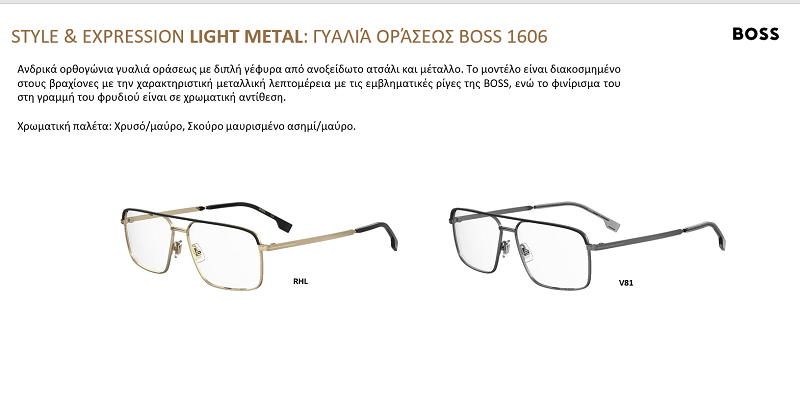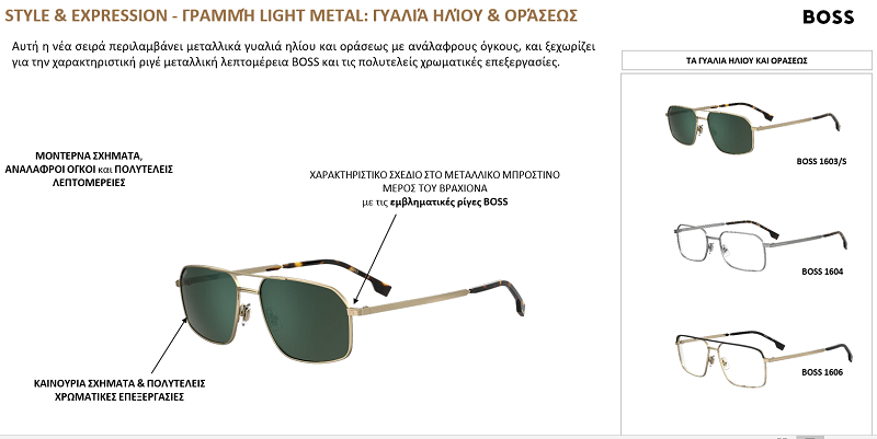 Η σειρά «style & expression» προτείνει νέα, μεταλλικά γυαλιά ηλίου και οράσεως με ΛΕΠΤΟ, ΕΛΑΦΡΥ ΣΚΕΛΕΤΟ που διακρίνεται από την χαρακτηριστική ριγέ μεταλλική λεπτομέρεια BOSS. Η σειρά ΠΡΟΣΦΕΡΕΤΑΙ σε ΠΛΗΘΟΣ πολυτελών χρωματικών επεξεργασιών.
