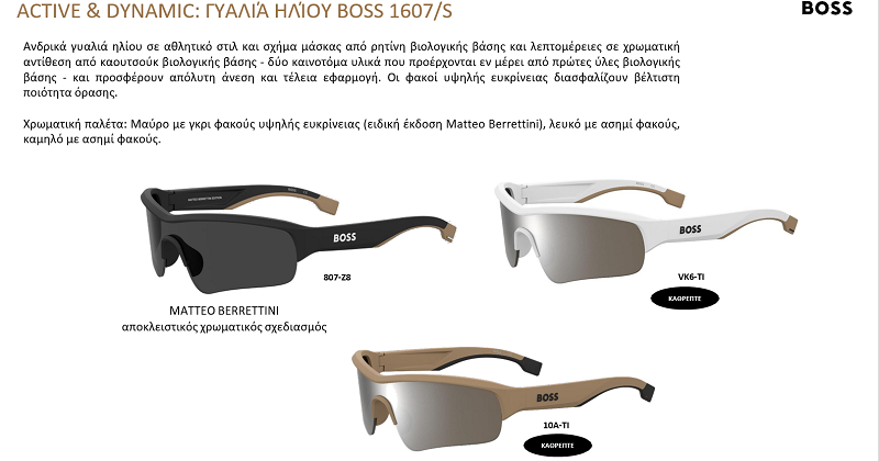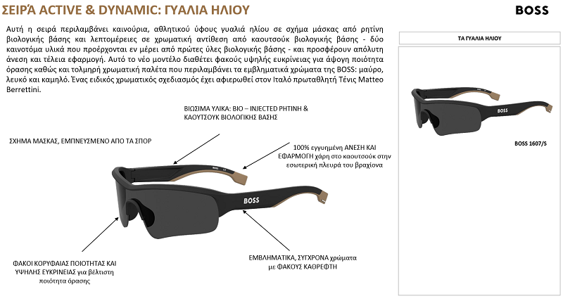 Η σειρά «ACTIVE & DYNAMIC» διαθέτει ΝΕΑ γυαλιά ηλίου με σπορ αισθητική, κατασκευασμένα από ρητίνη βιολογικής βάσης που αναδεικνύει λεπτομέρειες από καουτσούκ βιολογικής βάσης σε χρωματική αντίθεση για μέγιστη άνεση και τέλεια εφαρμογή. Αυτό το νέο μοντέλο, το οποίο διαθέτει φακούς υψηλής ευκρίνειας για άψογη ποιότητα όρασης, προσφέρεται σε τολμηρούς χρωματισμούς – που περιλαμβάνουν τα εμβληματικά χρώματα της BOSS: μαύρο, λευκό και καμηλό. ΕΠΙΠΛΕΟΝ, ένας ειδικός χρωματικός σχεδιασμός είναι ΑΦΙΕΡΩΜΕΝΟΣ στον Ιταλό πρωταθλητή Τένις Matteo Berrettini, ΣΥΜΠΛΗΡΩΝΟΝΤΑΣ ΤΗ ΣΕΙΡΑ ΜΕ ΑΠΟΛΥΤΑ ΑΘΛΗΤΙΚΟ ΣΤΙΛ.