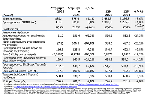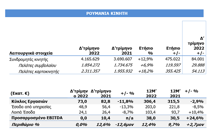 Η συνολική πελατειακή βάση σημείωσε σημαντική αύξηση στο τρίμηνο, αντανακλώντας την αύξηση κατά 6,9%, στους συνδρομητές συμβολαίου και τη σημαντική αύξηση στην καρτοκινητή. Τα λοιπά έσοδα μειώθηκαν κατά 8,7%, κυρίως λόγω της κατάργησης δραστηριοτήτων MVNO. H Telekom Romania Mobile κατέγραψε μηδενικό Προσαρμοσμένο EBITDA (AL) στο τρίμηνο λόγω μειωμένων εσόδων και λοιπών εκτάκτων. Συνολικά, το 2022, η Telekom Romania Mobile κατέγραψε ισχυρή αύξηση 24,6% στο EBITDA, στα €38,0 εκατ.