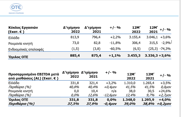 Το Δ’ τρίμηνο του 2022, τα ενοποιημένα έσοδα του Ομίλου OTE αυξήθηκαν κατά 1,1% και διαμορφώθηκαν σε €885,4 εκατ. Στην Ελλάδα, τα έσοδα αυξήθηκαν κατά 2,2%, στα €813,9 εκατ., κυρίως λόγω των ισχυρών επιδόσεων στην κινητή και στις υπηρεσίες ICT. Στην Ρουμανία, τα έσοδα μειώθηκαν κατά 11,8% και διαμορφώθηκαν στα €73,0 εκατ., αντανακλώντας κυρίως τη συνεχιζόμενη επίδραση από τη μείωση στα τέλη τερματισμού κινητής τηλεφωνίας (MTR).