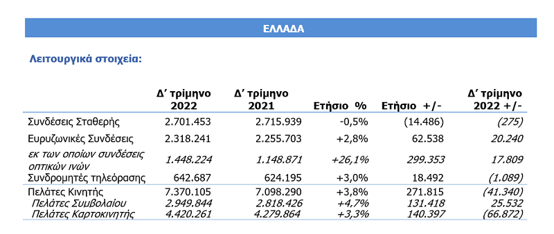 Στην αγορά σταθερής, η οποία συρρικνώθηκε κατά τη διάρκεια του 2022 εξαιτίας αποσυνδέσεων κυρίως σε υπηρεσίες φωνής, ο ΟΤΕ θωράκισε τη θέση του διατηρώντας αμετάβλητη την πελατειακή του βάση κατά το τρίμηνο. Η εταιρεία συνεχίζει να αναπτύσσεται στην αγορά ευρυζωνικών υπηρεσιών, καθώς οι ανταγωνιστικές της υπηρεσίες και η αναβάθμιση των πελατών φωνής σε ευρυζωνικές υπηρεσίες, οδήγησαν σε νέα αύξηση των συνδρομητών ευρυζωνικών υπηρεσιών κατά 2,8% σε σύγκριση με το τέλος του 2021, σε 2.318 χιλιάδες. Ο ΟΤΕ προσέλκυσε την πλειονότητα των καθαρών νέων συνδέσεων της αγοράς στο τρίμηνο. Η διείσδυση των ευρυζωνικών συνδέσεων στις συνολικές γραμμές σταθερής ανήλθε στο 86% στο τέλος του Δ’ τριμήνου 2022, από 83% έναν χρόνο πριν.