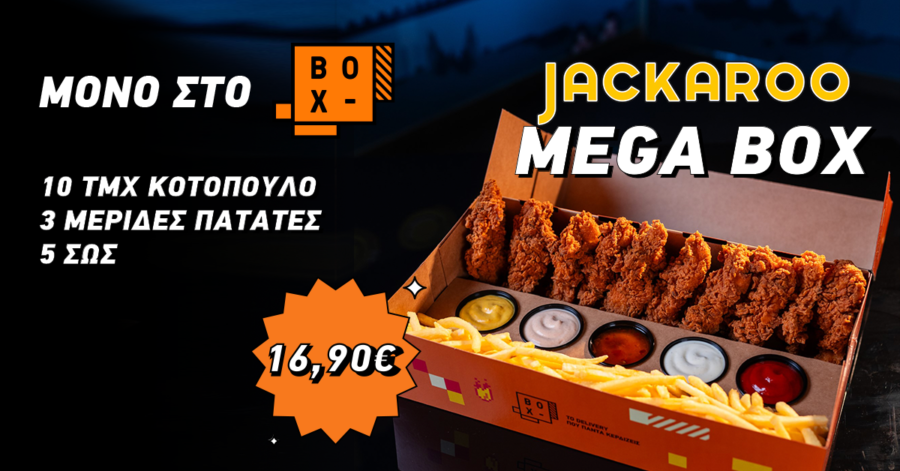 Αποκλειστικά στο ΒΟΧ οι πελάτες απολαμβάνουν και το νέο μενού JACKAROO MEGA BOX, που αποτελείται από 10 τεμάχια κοτόπουλο, 3 μερίδες τηγανητές πατάτες και 5 διαφορετικές σως, στα 16,90€.