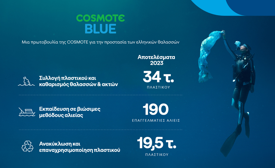 Τα πρώτα σημαντικά αποτελέσματα φέρνει η πρωτοβουλία COSMOTE BLUE για την προστασία των ελληνικών θαλασσών και τη δημιουργία ενός βιώσιμου θαλάσσιου οικοσυστήματος, που ξεκίνησε η COSMOTE το 2023 σε συνεργασία με την κοινωνική επιχείρηση «Εναλεία», η οποία μαζί με την αλιευτική κοινότητα, συλλέγει θαλάσσιο πλαστικό από την Μεσόγειο. Από την έναρξη της πρωτοβουλίας COSMOTE BLUE επαγγελματίες αλιείς πραγματοποίησαν δράσεις καθαρισμού και συγκέντρωσαν 34 τόνους πλαστικού από τις θαλάσσιες περιοχές και ακτές του Θερμαϊκού, της Χαλκιδικής και του Αργοσαρωνικού κόλπου, με 40 αλιευτικά σκάφη.