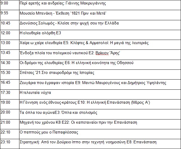 Το μεγάλο αφιέρωμα, μεταξύ άλλων, περιλαμβάνει το νέο ντοκιμαντέρ «Ο παππούς μου ο Παπαφλέσσας» (στις 22.10), σε σκηνοθεσία Κλεώνης Φλέσσα. H απόγονος του Μεσσήνιου οπλαρχηγού και πολιτικού μας ταξιδεύει στη ζωή και τη δράση του διάσημου προπάππου της, φέρνοντας στο επίκεντρο το ταξίδι του στην Κωνσταντινούπολη την εποχή του Ρομαντισμού και τον τρόπο με τον οποίο έγινε μέλος της Φιλικής Εταιρείας.