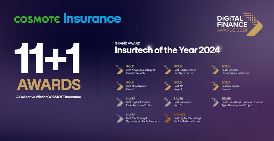 Το COSMOTE Insurance, η προηγμένη ψηφιακή πλατφόρμα σύγκρισης και αγοράς ασφαλειών της COSMOTE, ξεχώρισε και φέτος για τη διάθεση εξαιρετικών προϊόντων και την παροχή υψηλής ποιότητας υπηρεσιών στους πελάτες της. Απέσπασε 6 Gold βραβεία στις κατηγορίες “Best New Special Digital Product Launch”, “Best CX/Customer Loyalty Initiative”, “Best Financial Performance Initiative”, “Best Core System Project”, “Best API Project”, “Best Insuretech Solution”, καθώς και 4 Silver βραβεία ως “Best Digital Initiative for Automotive Product”, “Best Insurance Portal”, “Best Operations/Business Process/Agile Development Project” και “Best Monitoring & Optimization Tools Solution”. Έλαβε, επίσης, 1 Bronze βραβείο στην κατηγορία “Best Digital Marketing/Social Media Initiative”.