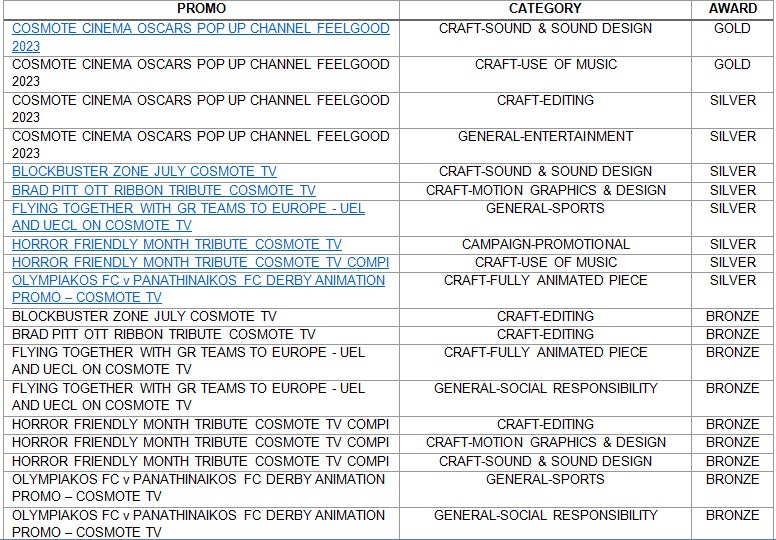 Στις κατηγορίες Craft – Sound & Sound Design και Craft – Use of Music, για τη χρήση του ήχου και της μουσικής στο promo του pop-up καναλιού COSMOTE CINEMA OSCARS, η COSMOTE TV κέρδισε 2 Gold βραβεία. Για το ίδιο promo trailer, η COSMOTE TV απέσπασε και 2 Silver βραβεία στις κατηγορίες Craft-Editing και General- Entertainment.