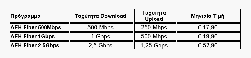 Το ΔΕΗ Fiber διατίθεται σε τρία πρωτοποριακά internet only προγράμματα, σχεδιασμένα για να καλύπτουν τις καθημερινές ανάγκες κάθε νοικοκυριού και επαγγελματία. Όλα τα προγράμματα βασίζονται σε 100% οπτική ίνα μέχρι το σπίτι (FTTH) και προσφέρουν εγγυημένες υπερυψηλές ταχύτητες, σταθερή απόδοση, Download/Upload 2:1 και τιμές προσιτές για όλους -χωρίς προϋπόθεση voucher- χωρίς ψιλά γράμματα ή κρυφές χρεώσεις.