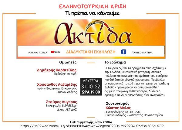 Ο όμιλος πολιτικής σκέψης και δράσης ΑΚΤΙΔΑ διοργανώνει διαδικτυακή εκδήλωση-συζήτηση, μέσω της πλατφόρμας zoom, την Δευτέρα 31 Οκτωβρίου 2022 από ώρα 19.00 ( 7 μ.μ. ), με θέμα: “Ελληνοτουρκική κρίση. Τι πρέπει να κάνουμε”.
