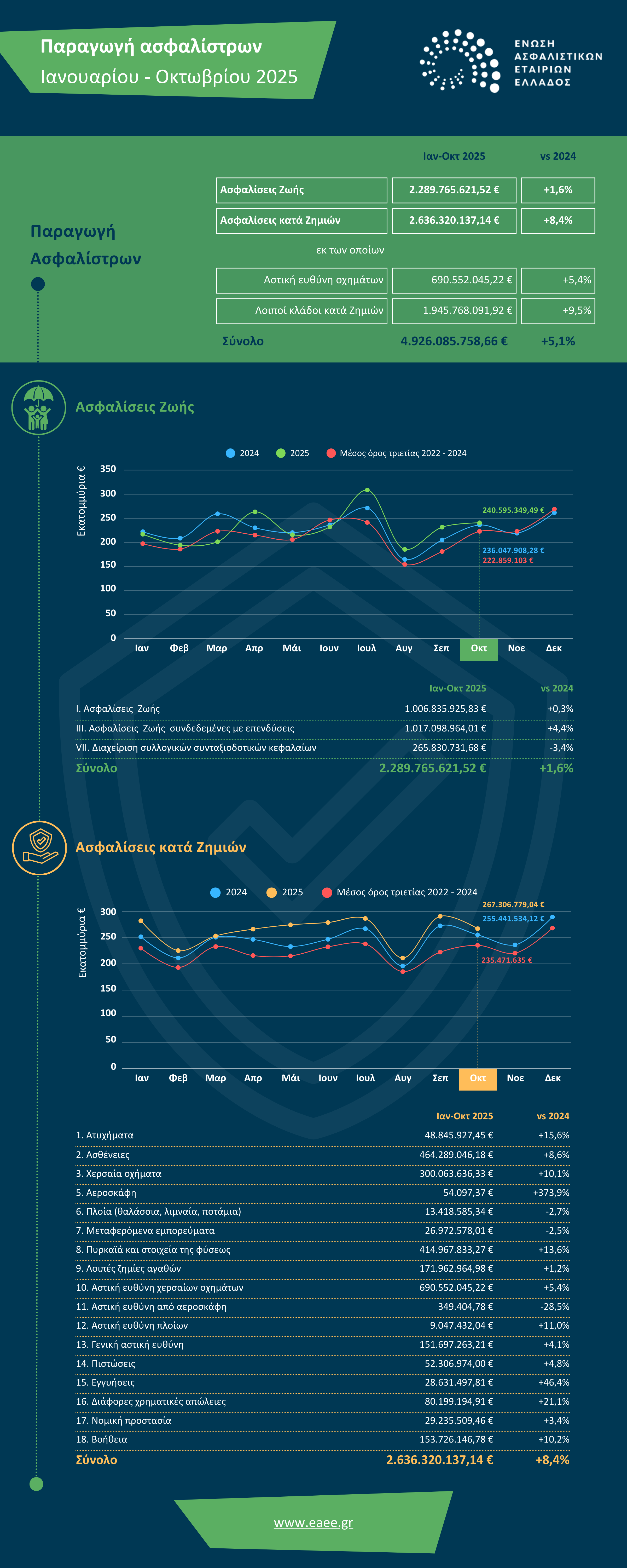 Σύμφωνα με τα στοιχεία αυτά (κατόπιν προσαρμογής των δεδομένων του προηγούμενου χρονικού διαστήματος με νεότερες απαντήσεις), από τη σύγκριση των δηλώσεων παραγωγής ασφαλίστρων των μηνών Ιανουαρίου – Οκτωβρίου 2025 των ανωτέρω επιχειρήσεων με τις αντίστοιχες της ίδιας περιόδου για το 2024 των ιδίων επιχειρήσεων, προκύπτουν τα παρακάτω: