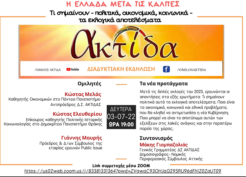 Ο Όμιλος Πολιτικής Σκέψης και Δράσης ΑΚΤΙΔΑ διοργανώνει διαδικτυακή εκδήλωση, την Δευτέρα 3 Ιουλίου 2023 και από ώρα 19.00, με θέμα: “Η Ελλάδα μετά τις κάλπες – Τι σημαίνουν πολιτικά, οικονομικά, κοινωνικά τα εκλογικά αποτελέσματα”.