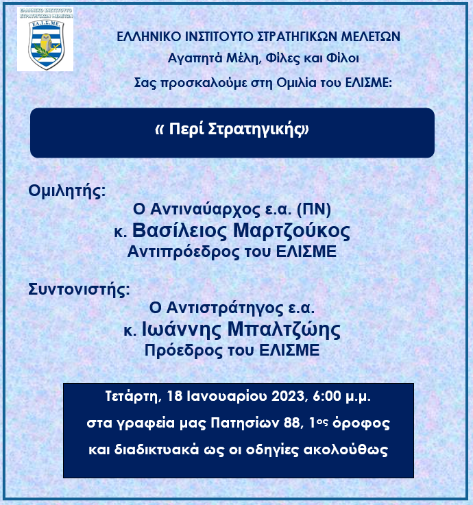 Το Ελληνικό Ινστιτούτο Στρατηγική Μελετών (ΕΛΙΣΜΕ) πραγματοποιεί την εκδήλωση “Περί Στρατηγικής” την Τετάρτη 18 Ιανουαρίου στις 18.00, με τις ομιλίες του αντιστράτηγου ε.α. και προέδρου του ΕΛΙΣΜΕ Ιωάννη Μπαλτζώη και του αντιναύαρχου ε.α. και αντιπροέδρου του Ινστιτούτου Βασίλειου Μαρτζούκου.