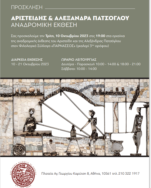 Ο Φιλολογικός Σύλλογος ΠΑΡΝΑΣΣΟΣ με χαρά ανακοινώνει την παρουσίαση της αναδρομικής έκθεσης γλυπτικής, ζωγραφικής, χαρακτικής και ψηφιδωτού της Αλεξάνδρας και του Αριστείδη Πατσόγλου, που θα φιλοξενηθεί στην αίθουσα του 3ου ορόφου του Συλλόγου, Πλατεία Αγ. Γεωργίου Καρύτση 8, από τη Δευτέρα 9 έως και το Σάββατο 21 Οκτωβρίου. Τα εγκαίνια θα πραγματοποιηθούν την Τρίτη, 10 Οκτωβρίου στις 18:00.
