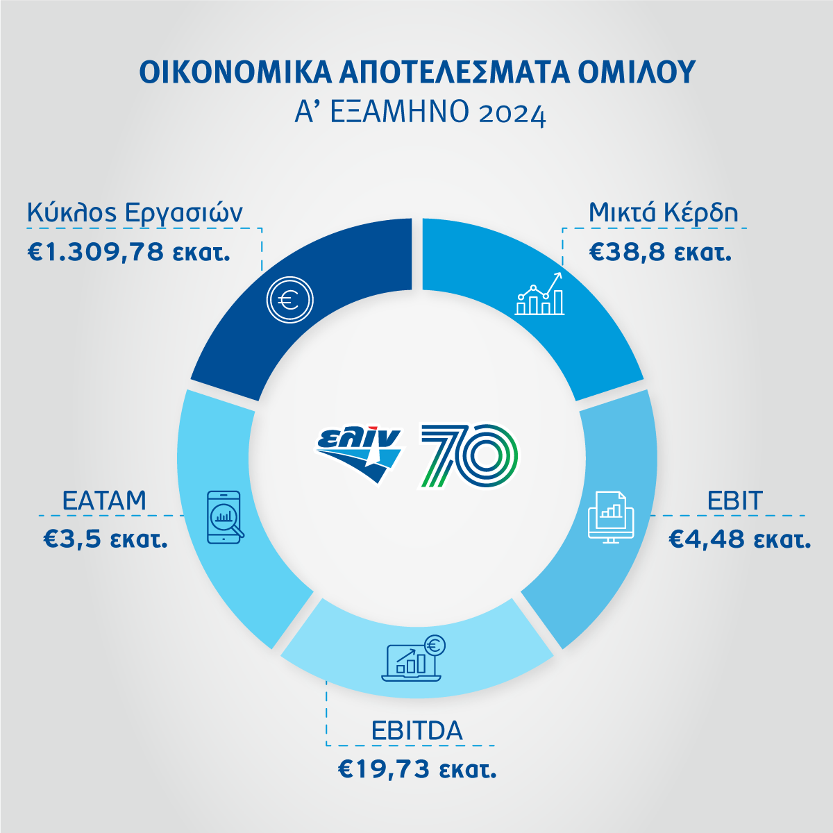 Ο ενοποιημένος κύκλος εργασιών του Ομίλου ελίν ανήλθε κατά το α’ εξάμηνο του 2024 σε €1.309,78 εκατ. έναντι €1.137,61 εκατ. του α’ εξαμήνου του 2023, καταγράφοντας αύξηση 15%. Για την ίδια χρονική περίοδο, τα μικτά κέρδη του Ομίλου ανήλθαν σε €38,8 εκατ. έναντι €31,6 εκατ. του α’ εξαμήνου του 2023 και τα κέρδη προ φόρων, χρηματοοικονομικών αποτελεσμάτων και αποσβέσεων (EBITDA) ανήλθαν σε €19,73 εκατ. έναντι €13,48 εκατ. του αντίστοιχου διαστήματος του 2023, παρουσιάζοντας αύξηση 46%.