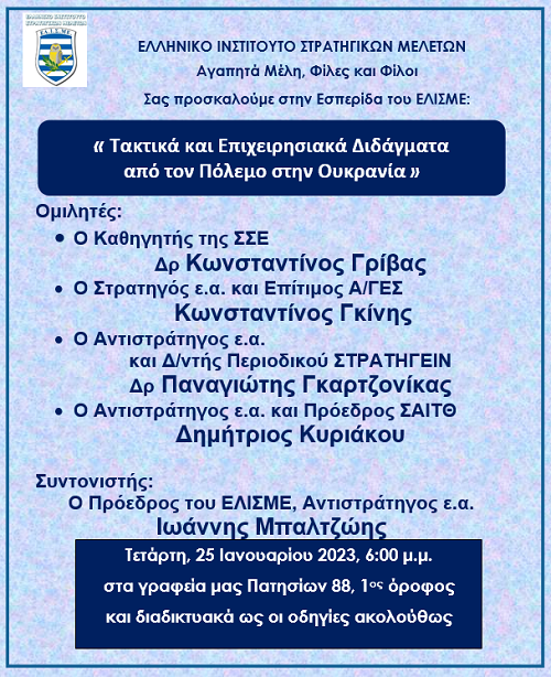 Το ΕΛΙΣΜΕ πραγματοποιεί εκδήλωση, με ζωντανή παρουσία, την Τετάρτη 25 Ιανουαρίου, στις 18.00 με θέμα “Τακτικά και επιχειρησιακά διδάγματα από τον πόλεμο στην Ουκρανία”.