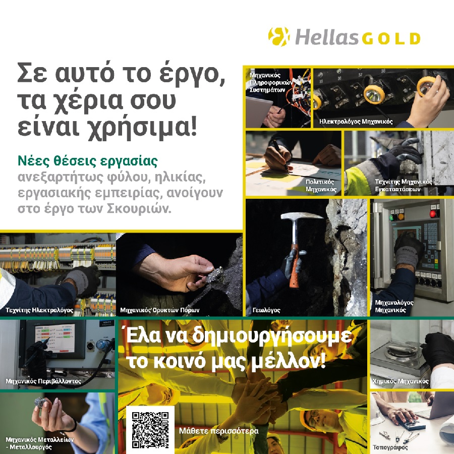 Για περισσότερες πληροφορίες σχετικά με τις ενημερωτικές εκδηλώσεις και τις ανοιχτές θέσεις εργασίας στο έργο των Σκουριών, καθώς και για ηλεκτρονική δήλωση ενδιαφέροντος, επισκεφτείτε το https://www.hellas-gold.com/anthrwpino-dynamiko/theseis-ergasias/ergasteite-stis-skouries.