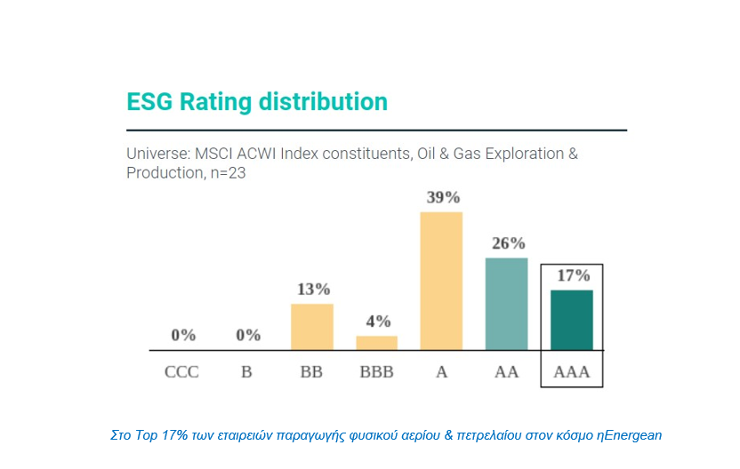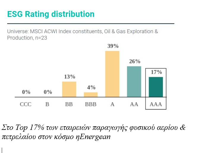 Η Morgan Stanley Capital Index (MSCI) αναγνωρίζει με τον πλέον εμφατικό τρόπο την ηγετική θέση που έχει η Energean ως εταιρεία, που εκτός από το φυσικό αέριο, εστιάζει σε κάθε περιοχή όπου δραστηριοποιείται στο Περιβάλλον, την Κοινωνία και την Εταιρική Διακυβέρνηση, τα γνωστά ως κριτήρια ESG (Environment, Social, Governance).