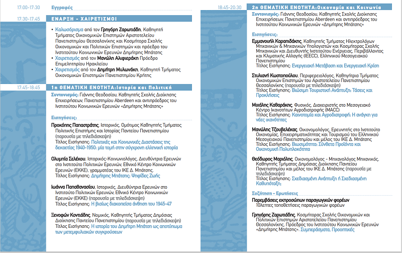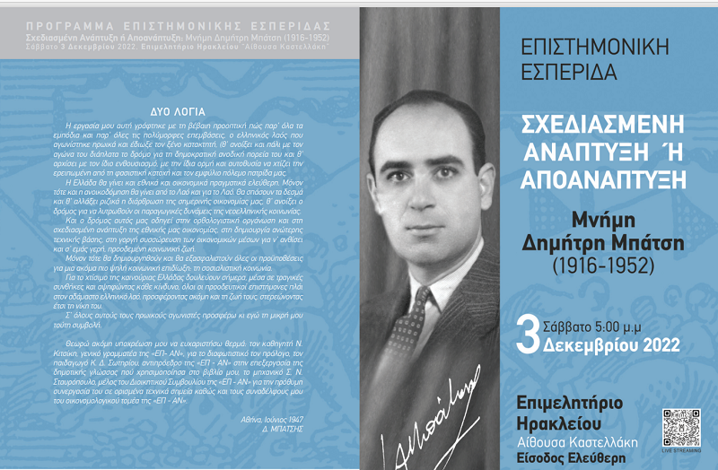 Το Ινστιτούτο Κοινωνικών Ερευνών “Δημήτρης Μπάτσης”, με την υποστήριξη του Επιμελητηρίου Ηρακλείου και του Μεσογειακού Κέντρου Ικανοτήτων Αγροδιατροφής διοργανώνει επιστημονική ημερίδα με τίτλο “«Σχεδιασμένη Ανάπτυξη ή Αποανάπτυξη; Δημήτρης Μπάτσης (1916-1952)”.