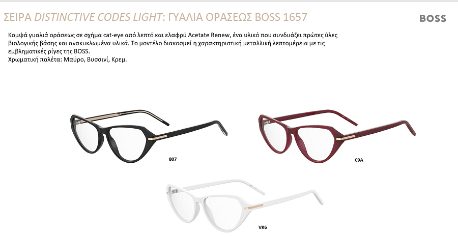 Η CAPSULE ΣΥΛΛΟΓΗ «DISTINCTIVE CODES LIGHT» ΠΑΡΟΥΣΙΑΖΕΙ ΕΝΑ ΚΑΙΝΟΥΡΓΙΟ ΚΟΜΨΟ ΚΑΙ ΚΛΑΣΙΚΟ ΜΟΝΤΕΛΟ ΓΥΑΛΙΩΝ ΟΡΑΣΕΩΣ, ΚΑΤΑΣΚΕΥΑΣΜΕΝΟ ΑΠΟ ΛΕΠΤΟ ΚΑΙ ΕΛΑΦΡΥ ACETATE RENEW, ΜΕ ΤΗ ΧΑΡΑΚΤΗΡΙΣΤΙΚΗ ΜΕΤΑΛΛΙΚΗ ΡΙΓΕ ΛΕΠΤΟΜΕΡΕΙΑ ΤΗΣ BOSS, ΤΟ ΟΠΟΙΟ ΔΙΑΤΙΘΕΤΑΙ ΣΕ ΜΙΑ ΓΚΑΜΑ ΦΙΝΕΤΣΑΤΩΝ ΑΠΟΧΡΩΣΕΩΝ.