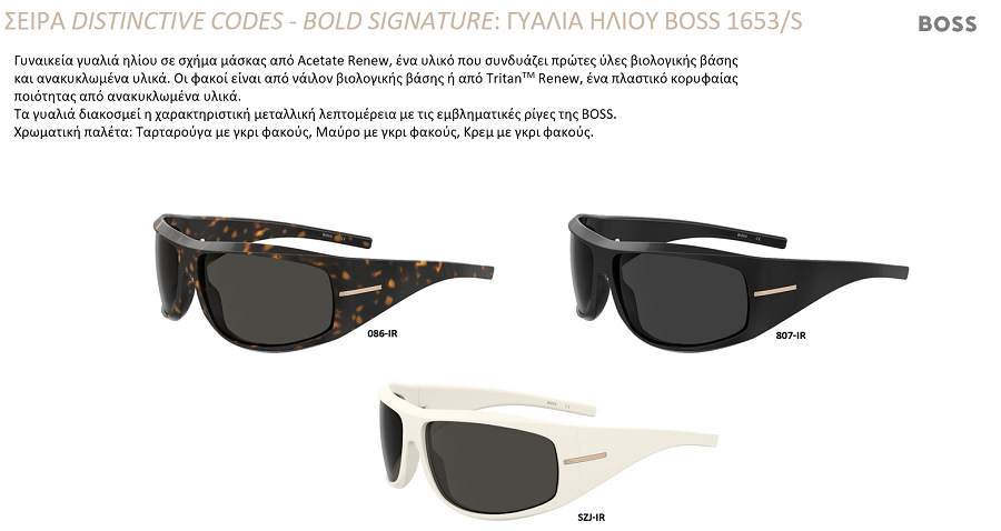 Η ΣΕΙΡΑ «DISTINCTIVE CODES», ΠΟΥ ΣΧΕΔΙΑΣΤΗΚΕ ΛΑΜΒΑΝΟΝΤΑΣ ΥΠΟΨΗ ΤΟΝ ΠΛΑΝΗΤΗ, ΔΙΑΘΕΤΕΙ ΦΙΝΕΤΣΑΤΕΣ ΠΡΟΣΘΗΚΕΣ: ΝΕΑ ΕΝΤΟΝΑ ΓΥΑΛΙΑ ΗΛΙΟΥ ΠΟΥ ΞΕΧΩΡΙΖΟΥΝ, ΜΕ ΤΟ ΚΑΙΝΟΥΡΓΙΟ ΜΕΤΑΛΛΙΚΟ ΛΟΓΟΤΥΠΟ BB ΝΑ ΑΠΟΤΕΛΕΙ ΤΗΝ ΑΠΟΛΥΤΗ ΛΕΠΤΟΜΕΡΕΙΑ ΥΠΟΓΡΑΦΗΣ. ΤΑ ΜΟΝΤΕΛΑ ΔΙΑΤΙΘΕΝΤΑΙ ΣΕ ΚΛΑΣΙΚΕΣ ΜΟΝΟΧΡΩΜΙΕΣ Η ΑΠΟΧΡΩΣΕΙΣ ΤΑΡΤΑΡΟΥΓΑΣ ΚΑΙ ΕΙΝΑΙ ΚΑΤΑΣΚΕΥΑΣΜΕΝΑ ΑΠΟ ACETATE RENEW, ΠΟΥ ΣΥΝΔΥΑΖΕΙ ΥΛΙΚΑ ΒΙΟΛΟΓΙΚΗΣ ΒΑΣΗΣ ΚΑΙ ΑΝΑΚΥΚΛΩΜΕΝΑ ΥΛΙΚΑ. ΟΙ ΦΑΚΟΙ ΤΟΥΣ ΕΙΝΑΙ ΕΙΤΕ ΑΠΟ ΝΑΙΛΟΝ ΒΙΟΛΟΓΙΚΗΣ ΒΑΣΗΣ ΕΙΤΕ ΑΠΟ TRITANTM RENEW, ΕΝΑ ΠΛΑΣΤΙΚΟ ΚΟΡΥΦΑΙΑΣ ΠΟΙΟΤΗΤΑΣ ΠΟΥ ΚΑΤΑΣΚΕΥΑΖΕΤΑΙ ΑΠΟ ΑΝΑΚΥΚΛΩΜΕΝΑ ΥΛΙΚΑ.