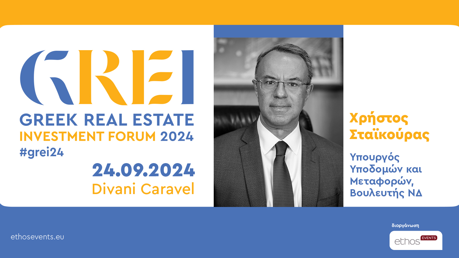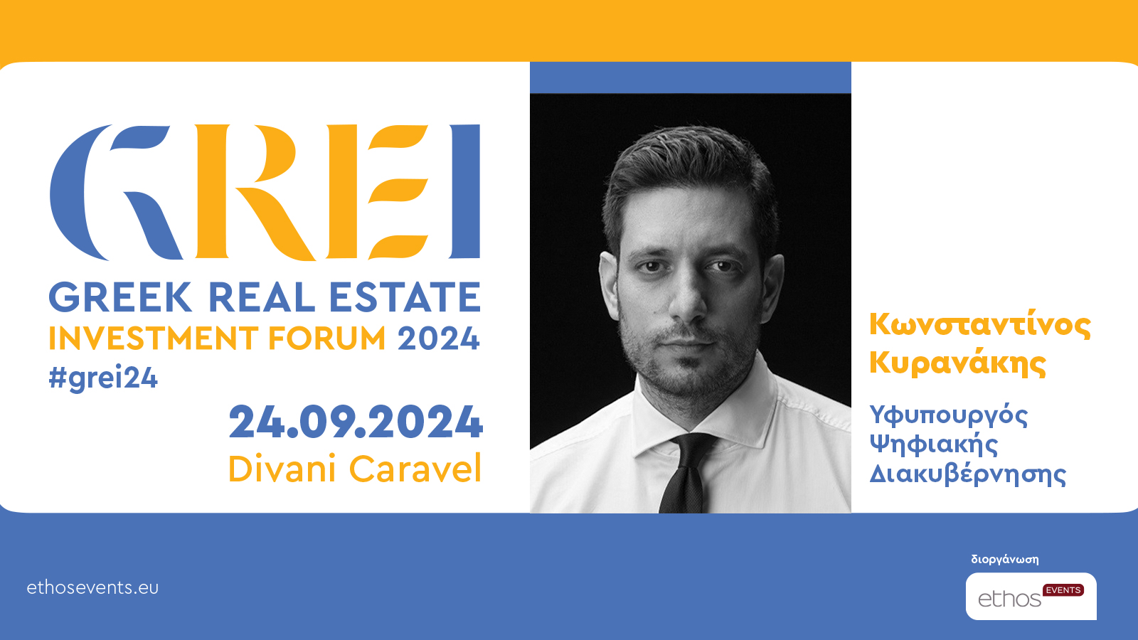 Το Greek Real Estate Investment Forum 2024 #grei24, θα διοργανωθεί στις 24 Σεπτεμβρίου 2024, από την ethosEVENTS σε συνεργασία με το οικονομικό και επιχειρηματικό portal banks.com.gr και το οικονομικό και επενδυτικό περιοδικό ΧΡΗΜΑ. Η συμμετοχή στo συνέδριο είναι εφικτή με φυσική παρουσία στο Divani Caravel και online μέσα από το LiveOn Expo Complex, το καινοτόμο 3D εκθεσιακό και συνεδριακό κέντρο της LiveOn.